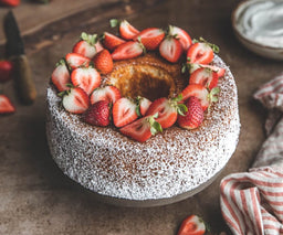 - Dust with powdered sugar and serve slices with whipped cream and strawberry slices.