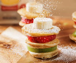 - Thread a skewer with four flapjacks, and one slice of each kind of fruit, placing the fruit in between the flapjacks.