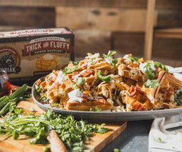 This Savory Breakfast Nachos recipe brings the fiesta to your breakfast table. Replace your tortilla chips a hearty base of Kodiak® Buttermilk & Vanilla Thick & Fluffy Power Waffles. Then, top them with the nacho toppings you crave most like bacon crumbles, cheddar cheese, jalapeños, scallions, cilantro, sour cream, and maple syrup. The best part? This dish comes together in a short 15 minutes!