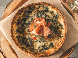 - Garnish the top of the quiche with prosciutto, dill, and a sprinkle of sea salt.