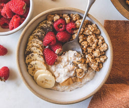 - Top the oats with the peanut butter, chia seeds, banana slices, raspberries, and granola.
