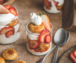 - Evenly divide the flapjack puffs, whipped cream, and strawberries with syrup between eight small cups, layering the ingredients on top of each other in several layers.