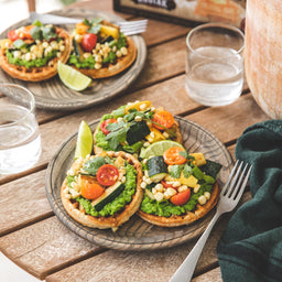 Who says waffles are just for mornings? These Summer Vegetable Tostadas flip the script by turning Kodiak Buttermilk & Vanilla Power Waffles into a crispy, crave-worthy base for all your garden-fresh favorites. With smoky paprika-coated zucchini, sweet corn, and juicy cherry tomatoes piled high, each bite packs a punch of flavor that’s totally un-waffle-able. A zesty pea and lime spread brings the perfect pop of green, topped off with a cool dollop of yogurt and a squeeze of lime to tostada-lly seal the deal.