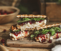 2. Add a tablespoon of cranberry sauce to the top of the Brie and spread evenly across.