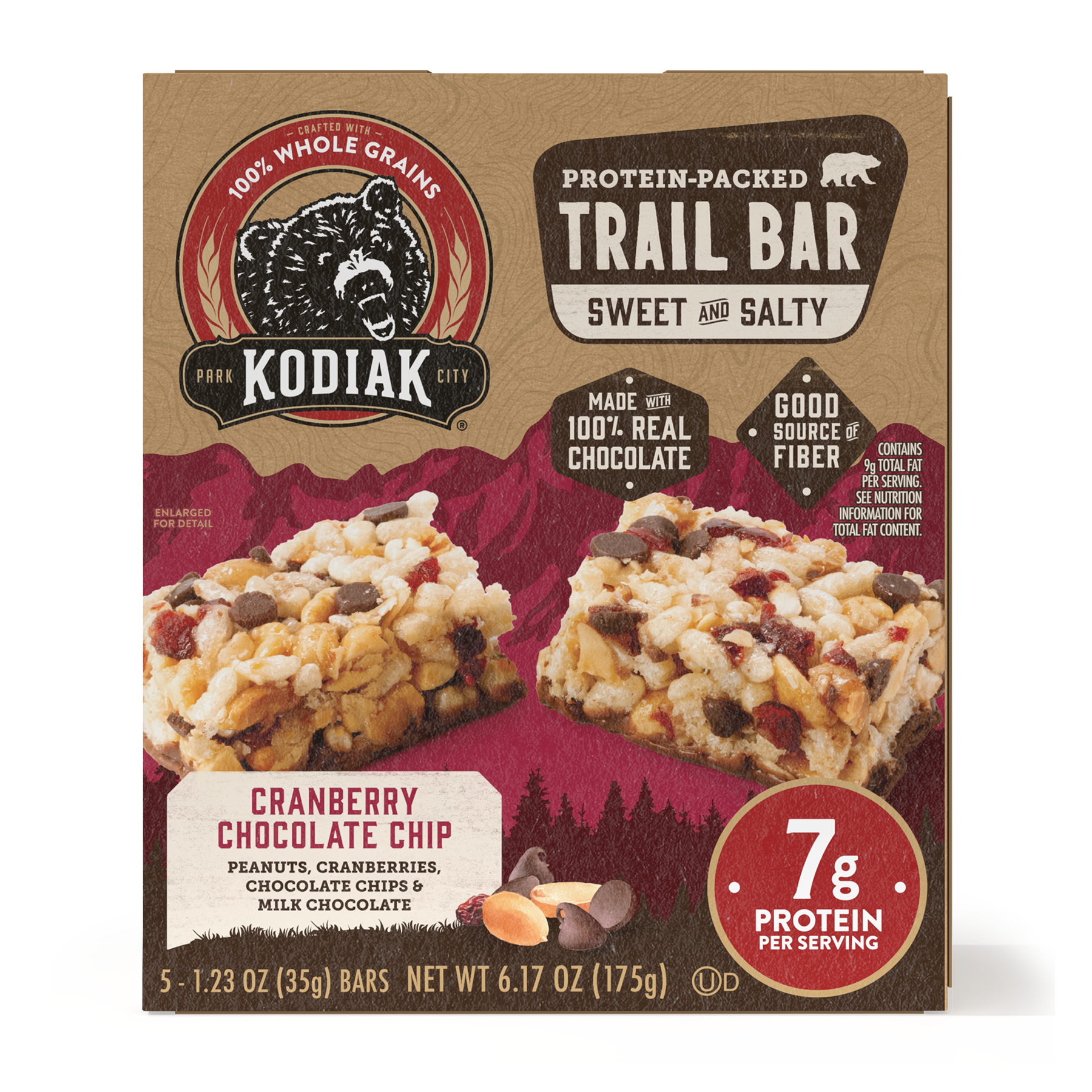 When you have real adventures on the horizon, fuel up on the real good stuff with a Kodiak Trail Bar. Whether you choose between Cranberry Chocolate Chip or Chocolate Almond (or stock up on both), each bar is packed with protein, 100% whole grains, and real ingredients like chocolate, nuts, seeds, and fruit. Dig into this chewy, sweet, and salty combo on epic days and every day.