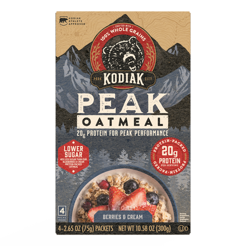 Kodiak® PEAK ™ Berries & Cream Oatmeal’s got all the right stuff to turn your aspiration into action. Lower sugar than our regular oatmeal line. 20g of protein. Crafted with 100% whole grains. Ready in a jiff.
